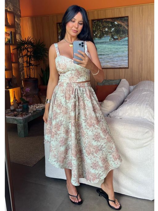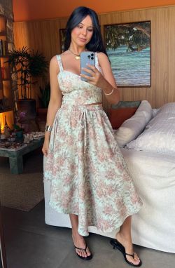 Saia Flora, uma fluidez incrível nessa viscose estampada de cair o queixo! Olha os elementos da estampa, até cajuzinho tem, demais né.